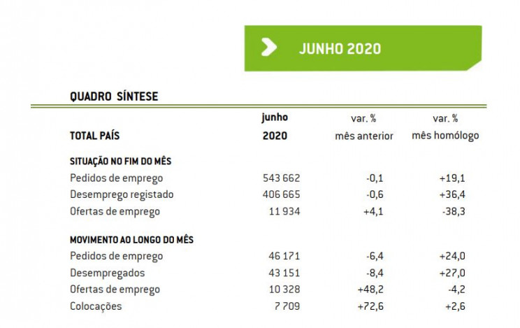 O número de desempregados inscritos nos centros de emprego (406.665 pessoas) aumentou 36,4% em junho em termos homólogos e recuou 0,6% face a maio, segundo dados divulgados esta segunda-feira (20 de julho de 2020) pelo Instituto do Emprego e Formação Profissional (IEFP). Dados esses que já abrangem, portanto, os meses afetados pela pandemia da Covid-19.