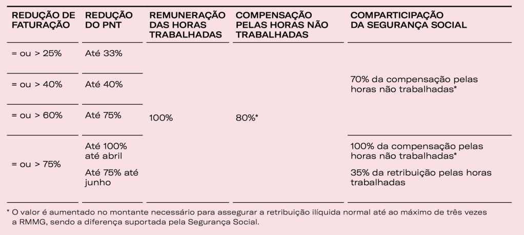 Este apoio é agora aplicável também aos membros de órgãos estatutários que exerçam funções de gerência, sendo o limite de redução do PNT aquele que for aplicável aos trabalhadores a seu cargo. O empregador que seja considerado micro, peque- na ou média empresa tem ainda direito à dispensa de 50% do pagamento de contribuições a seu cargo relativas aos trabalhadores abrangidos. Este regime vigorava até 31 de dezembro de 2020 e é agora prorrogado até 30 de junho de 2021. Mantém-se a proibição de fazer cessar contratos de trabalho por despedimento coletivo, despedimento por extinção do posto de trabalho, ou por despedimento por inadaptação durante a redução e nos 60 dias seguintes, bem como distribuir dividendos, sob qualquer forma.