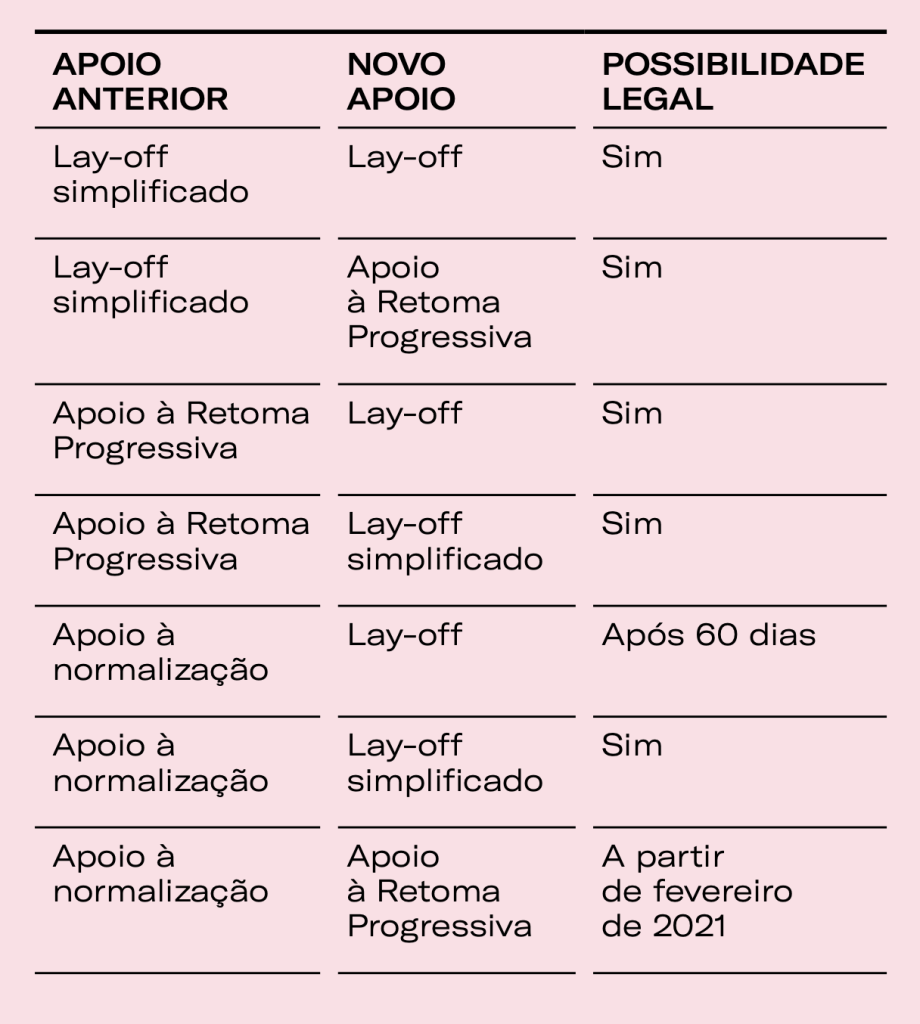 Apoio para empregadores que beneficiaram anteriormente dos apoios previstos no Decreto-Lei n.o 10-G/2020, de 26 de março, e consistia numa de duas modalidades: uma RMMG por trabalhador abrangido pelas medidas, pago de uma só vez, ou duas RMMG por trabalhador abrangido, pago de forma faseada ao longo de seis meses. O Decreto-lei 8-B/2021 de 22 de janeiro de 2021, estabelece-se que estes dois regimes se excluem mutuamente até janeiro de 2021. Resulta daqui que os referidos apoios podem ser sequenciais, desde que o Apoio à Retoma Progressiva seja requerido a partir de fevereiro de 2021. O diploma não se estabelece qualquer impedimento para o recurso posterior ao lay-off simplificado.