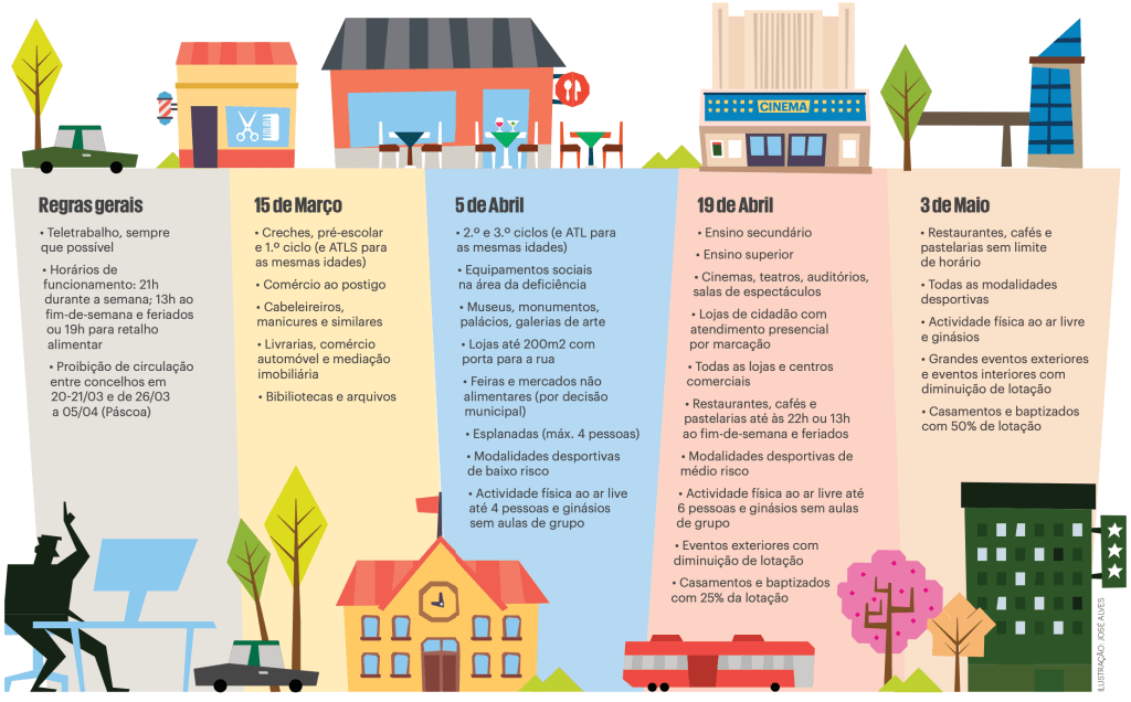 Se tudo correr como previsto e não houver um grande aumento de casos de covid-19, a 5 de Abril, podem abrir as lojas até 200 metros quadrados com porta para a rua e a 19 de Abril podem abrir todas as lojas e centros comerciais.