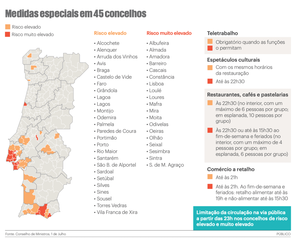 - os restaurantes, cafés e pastelarias só podem funcionar até às 22h30 durante a semana e até às 15h30 ao fim-de-semana e feriados (no interior, com um máximo de quatro pessoas por grupo; em esplanada, seis pessoas por grupo);