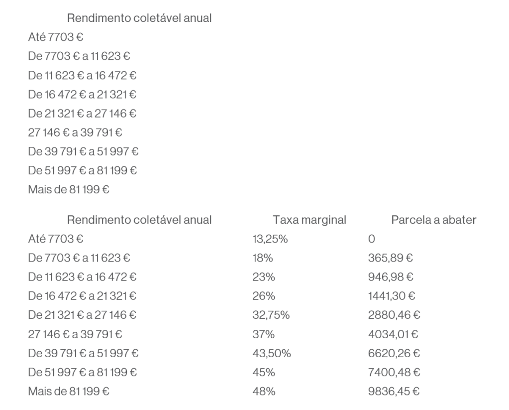 O primeiro escalão passa a abranger, a partir de 2024, os rendimentos coletáveis até 7703 euros. Todos os escalões seguintes são igualmente revistos.