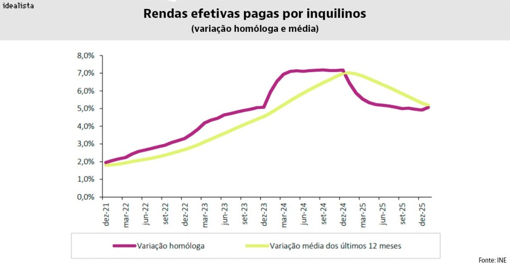 As rendas efetivamente pagas pelos inquilinos subiram 5,1% em janeiro de 2026 (face a 4,9% em dezembro), sugerindo estabilização da subida em torno dos 5% após meses de desaceleração.